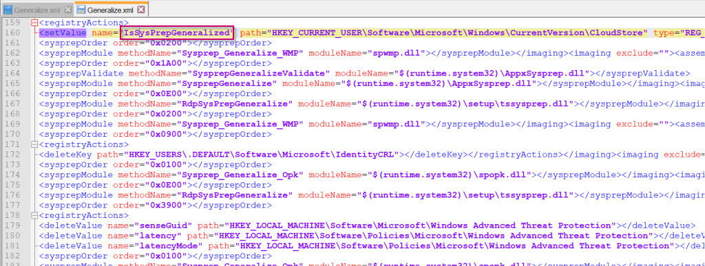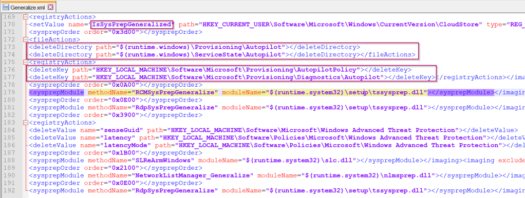 The next thing what came across my mind was using the SMSTSPostAction variable, which would copy the Offline AutoPilot profile to to the C:\Windows\Provisioning\Autopilot\ folder after the OSD and therefore sysprep was finished. The problem however with the SMSTSPostAction variable is that it cannot handle unexpected reboots of applications… lucky as I was some of the apps have unexpected reboots (like the fabulous HP Hotkeys :-)). So still no resolution, which got me thinking what if we can change the sysprep process to only skip the removal of the Autopilot files during the OSD the problem is fixed! At that time I had no idea that the command: sysprep.exe /generalize /oobe /shutdown was refering to a generalize.xml file. But after a few minutes of digging I understood the process, opened the generalize.xml file and understood what was removing the autopilot profile during the sysprep process.