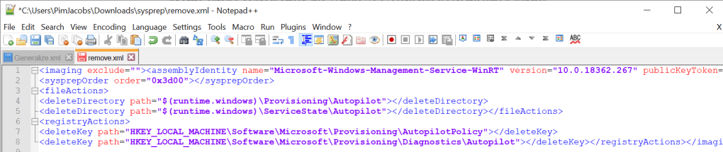 As you can see in the second image four lines have been added within the generalize.xml of Windows 10 1903, which triggers sysprep to remove the autopilot profile which you have put into the C:\Windows\Provisioning\Autopilot folder during OSD, basically it’s undoing the file copy. I took me a lot of headaches before I noticed it was the actual sysprep process which was causing this as it was working within Windows 10 1809. Now I did knew what was causing it I realized there were two solutions.