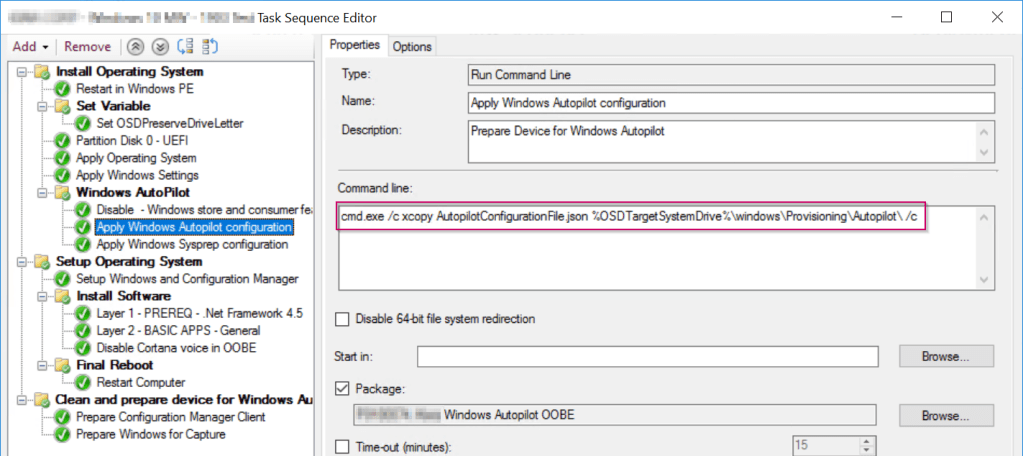 When finished I saved the file somewhere safe so it can be used in the next step within a ConfigMgr package, as now we need the generalize.xml file without the lines mentioned above to be copied over during the OSD same as we do for the offline autopilot profile. As you can see I used two steps, the first one which copies over the autopilot profile, the second once which replaced the sysprep Gernalize.xml file.