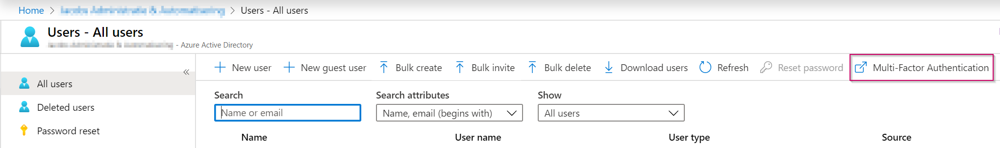 You can find this Office 365 MFA portal if you go to the Azure portal, open the ‘Azure Active Directory‘ blade, click on the ‘Users‘ tab and from there hit ‘Multi-Factor Authentication‘.