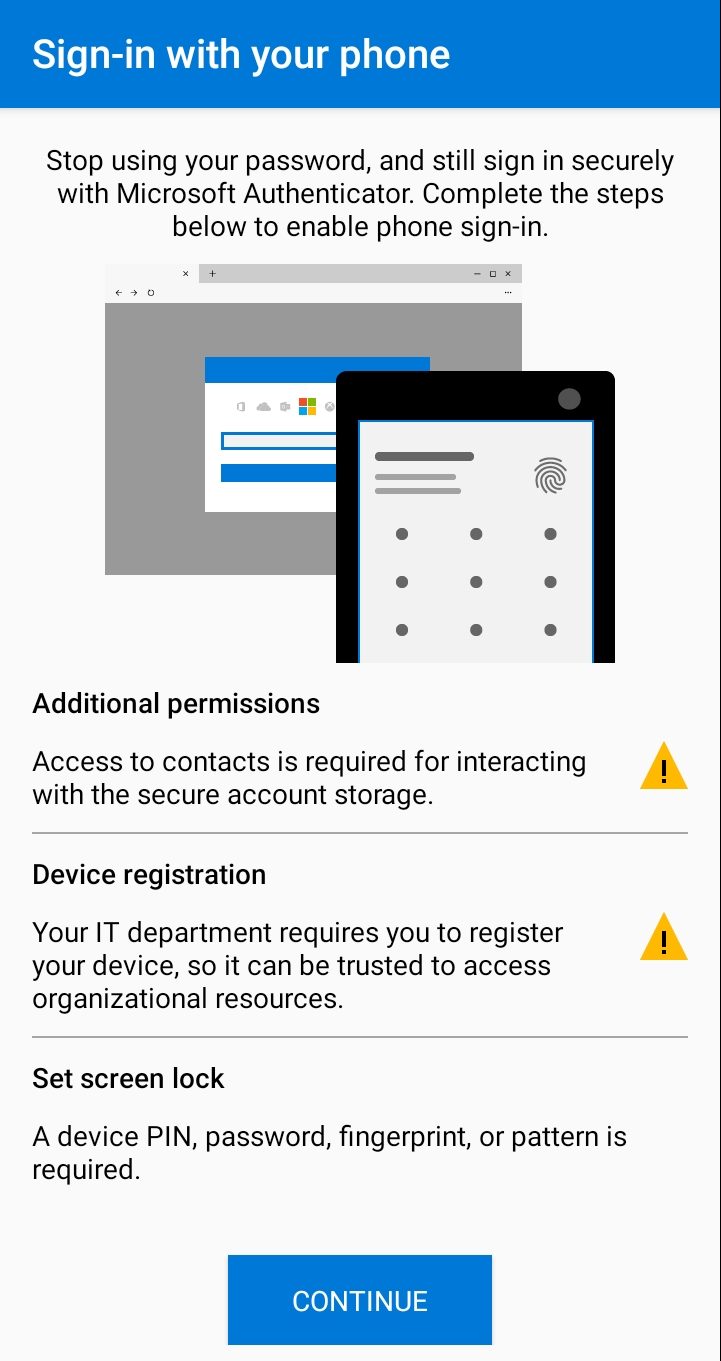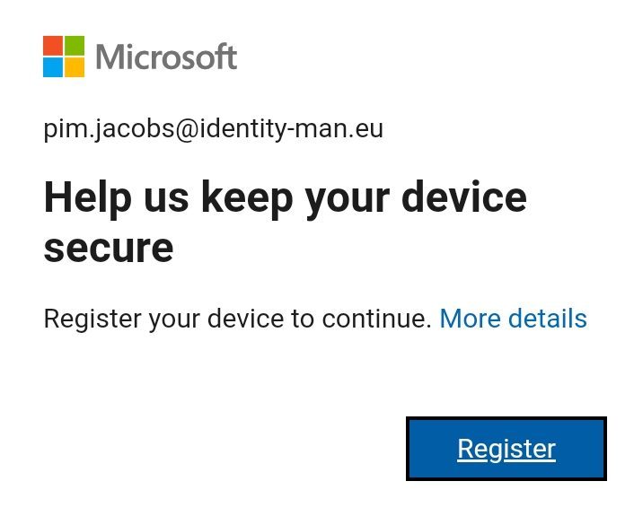 Once you hit the ‘Continue‘ button you will be asked to ‘Register‘ your mobile device, please select ‘Register‘ to complete the registration of your mobile device within the Azure AD to make sure it becomes usable for password-less phone sign-in (this doesn’t mean the device will be managed, it’s just registration against the Azure AD).
