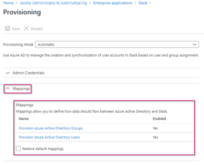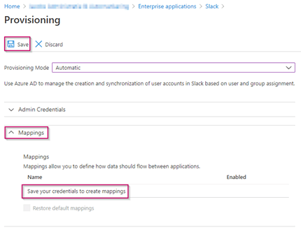 Now that the provisioning connection to Slack is active, it’s time to make sure to walk through the provisioning configuration. At this time provisioning is still disabled and therefore no data will be exported from Azure AD to Slack. Before we can configure / change the data export we first need to save the configuration before we can alter the ‘Mappings’ configuration, therefore hit ‘Save’.