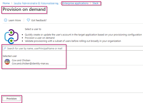 Now let’s assume you have added a users to this group and don’t want to wait for the 40 minute sync interval, you can also provision one or more specific users on demand by using the ‘Provision on demand’ feature beneath the provisioning settings. Keep in mind that, in case you used ‘Sync only assigned users and groups’, for that to work the user has to be a member of the user-group which you have assigned to the Enterprise Application.