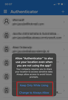 IMPORTANT NOTE: It’s important here for the user to change this to ‘Always Allow’ as in the next 24 hours from the moment the user approved his sign-in and whereby the user is still accessing the resource, the device GPS location is shared silently once per hour. This can of course only be verified when the user did select ‘Always Allow’.