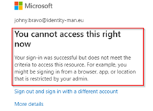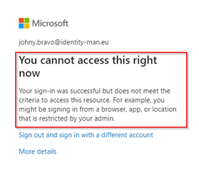 An example of this behavior is shown above where a sign-in was blocked, this as the user was in a country (based on GPS Coordinates) which wasn’t allowed to be used to sign-in to an application attached to Azure Active Directory.