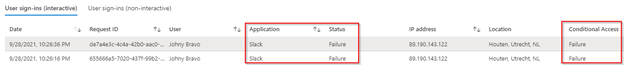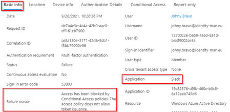 If you look at the basic info in one of these lines, we can see that ‘Access has been blocked by Conditional Access Policies’.