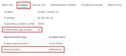 Once we than look in the location info we can see the user has shared their Authenticator App Location and is therefore matching the named location ‘Netherlands’.