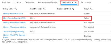 And lastly, when we look in the Conditional Access info we can see that the ‘Block Sign-in from NL (GPS)’ policy is causing this Failure (which in our example is a good result, as we want to block a sign-in from the Netherlands in this example).