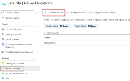 To make sure your users can use this new GPS feature as a Named Location from Conditional Access let’s start with the required steps. For that go to ‘Azure Active Directory’, click on ‘Security’ and hit ‘Named Locations’. Within the ‘Named Locations’ pane hit ‘+ Countries location’.