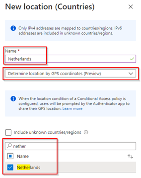 Give this new location a Friendly Name and make sure to select ‘Determine location by GPS coordinates (Preview)’. In the list of counties select the countries which you want to make a member of this named location (i.e. if your named location is called Europe, select all countries of Europe).