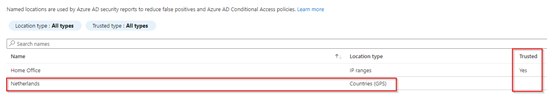 As you can see in the list of ‘Named locations’ the location has been added with location type ‘Countries (GPS)’ and doesn’t have the ‘trusted’ state as we do have with IP ranges (which is logical as we don’t want to trust a whole country 😊).