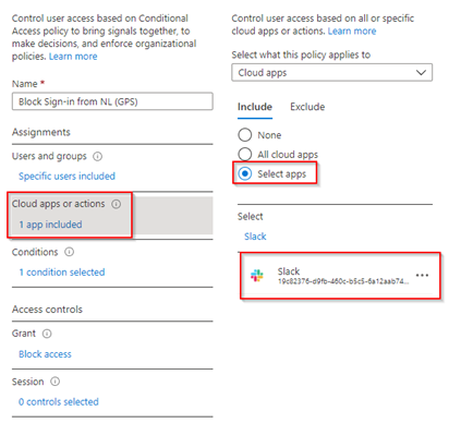 In the ‘Cloud apps or actions’ select ‘Select apps’ and include the individual app(s) which you want to include within this conditional access rule, in my example we therefore use Slack.