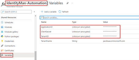 Within the Automation Account you created, go to ‘Variables’ and in here make sure to add the variables: