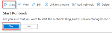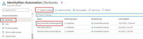Once configured within the Automation Account, go to ‘Runbooks’, hit ‘+ Create a runbook’, give the Runbook a name and make sure to select ‘PowerShell’ as the runbook type and hit ‘Create’. As you can see below, I’ve named my runbook ‘Blog_GuestLifeCycleManagement’.