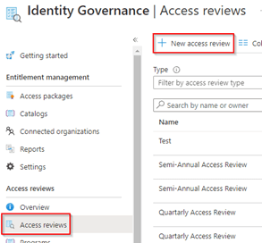 Now to get this configured, let’s start with Step 1, which is creating an Access Review within Identity Governance (to cleanup group membership), therefore go to the Azure Active Directory, hit Identity Governance, go to the ‘Access Reviews’ and hit ‘+ New access review’.