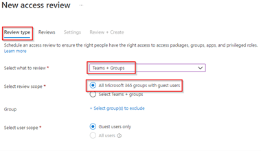 Within the ‘Review Type’ when creating this new access review, make sure to select ‘Teams + Groups’, select ‘All Microsoft 365 Groups with guest users’ and then hit ‘Next’.