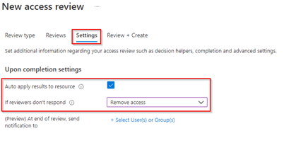 Within the ‘Settings’ of the access review let’s make sure the ‘auto apply results to resource’ is checked and configure what happens to reviewers who don’t respond. In my case I’ve selected ‘Remove Access’ this so when the reviewers don’t respond access will be removed. Eventually select a user who should receive notifications at the end of the review.