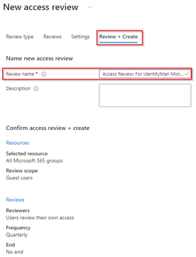 At the ‘Review + Create’ settings pane please make sure to provide a review name (this is what end users will also see within the email being send out, so please make sure to provide a correct name here which is familiar to your guest users). And once ready hit ‘Create’.