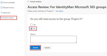 If the user decides to hit ‘Start Review’, he or she can extend access by selecting ‘Yes’ or can decide to select ‘No’ to remove their membership. When required a reason can be filled in by the guest user and once ready he or she can hit ‘Submit’.