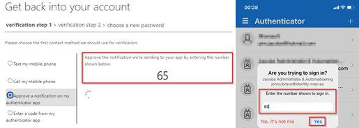 Besides sign-ins this feature is supported as well during a self-service password reset, when you have enabled the ‘App Notification’ option as an administrator within the self-service password reset authentication methods. The behavior which your end users will see is shown below.