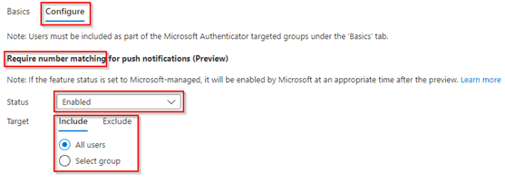 Now go to the Configure settings tab, here make sure to configure the ‘Require number matching’ feature as well. In here make sure the setting ‘Require number matching’ is therefore set to ‘Enabled’. And set the setting to ‘All users’ or include a specific group. important here to mention is that when you’re using an include group users will only be targeted for number matching if they are included in the basics settings, as configured earlier, as well.