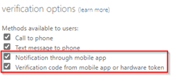 To make sure your users can use this new feature, called Number Matching, let’s make sure your Azure Active Directory is configured correctly. The first thing we need to check are the ‘old’ Multi Factor Authentication settings page. On this page, make sure that under the ‘Verification options’ the checkboxes for ‘Notification through mobile app’ & ‘Verification code from mobile app or hardware token’ are selected.