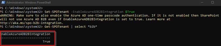 As we can see the ‘EnableAzureADB2BIntegration’ setting is set to ‘False’, which means SharePoint Online will not look at the Azure AD B2B configuration which is in place. Now to enable this setting, in the same PowerShell session we just used to check the setting, run the following PowerShell commands: