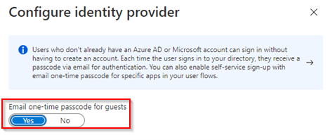 Within the configuration of the Email one-time passcode for guests make sure the switch is set to ‘Yes’, which indicates this functionality is enabled.