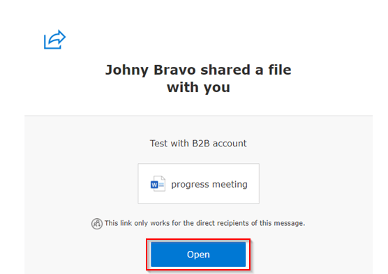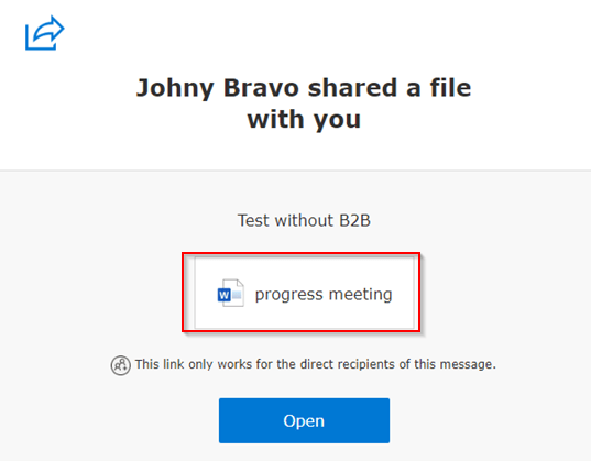 Once send the ‘SharePoint B2B Guest’ user receives an email on the provided email address to go to the document ‘Progress Meeting’ in this example. He or she can click on the document to open it in Word Online.
