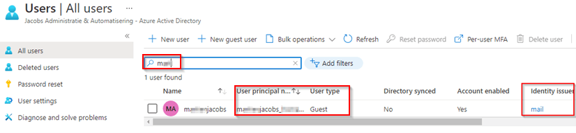 Until here everything is still based on a single factor as you may have noticed, but now an Azure AD B2B guest user is created within your Azure Active Directory. This can be seen below, whereby each user which is provisioned via this method has ‘Mail’ mentioned as an Identity Issuer.