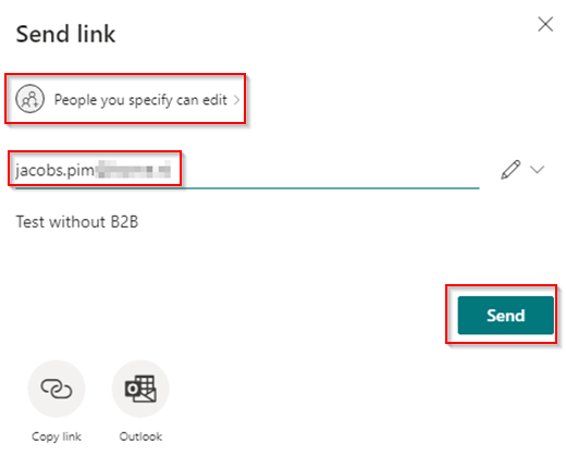 The end users shares a document or folder via SharePoint Online, provides permissions and fills in the email address of the desired ‘SharePoint B2B Guest’ user who should have access and hits ‘Send’.
