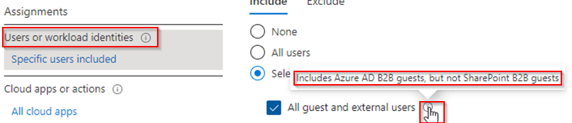 As these ‘SharePoint B2B Guest’ users bypass all Azure Active Directory policies, whereby you can think off Conditional Access which enforces multi-factor authentication or Access Reviews which challenges users to review access, the security level of these ‘SharePoint B2B Guest’ users is quite low. The Image below is an example print screen from the Conditional Access configuration, which says when selecting ‘All guests and external users’ it only applies for ‘Azure AD B2B guests and NOT SharePoint B2B Guests’.