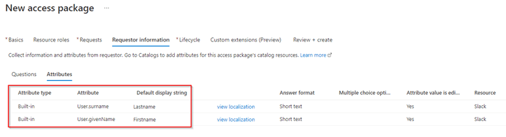 When we switch to the ‘Attributes’ tab we can see that these attributes have been already made required (as we have added them earlier). Important to note is that when you require different attributes to be populated you can’t do this via the Access Package but need to put them on the resource in the catalog. Once ready hit ‘Next: Lifecycle’.