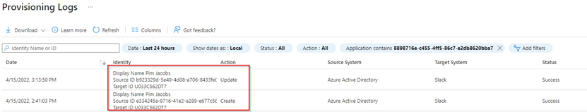 If we are going to look in the provisioning logs beneath the application, we can see that the user is created and then updated.