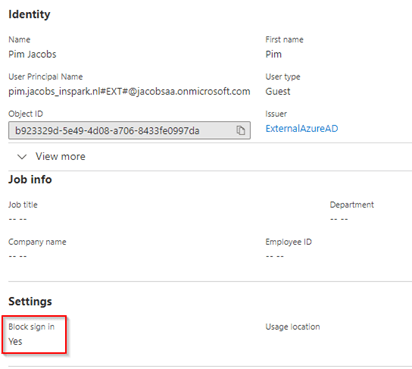 And secondly as the user was provisioned via the Access Package process and the user lost his last ‘access package assignment’ the user is blocked for signing in and will be removed from the tenant 30 days later.