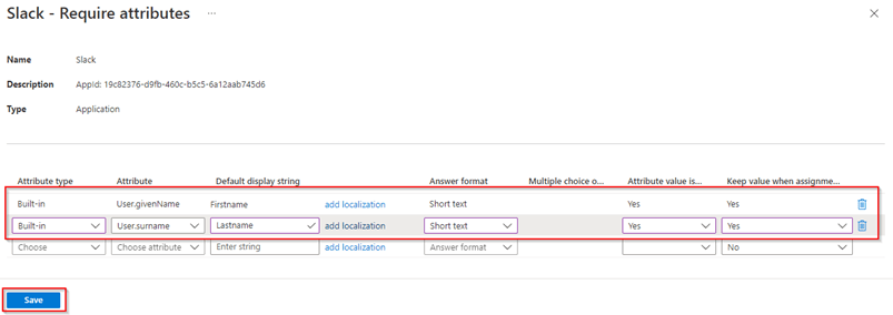 Now add the attributes you need to have in the Slack application as well, in my case I only made the ‘Givenname (Firstname)’ and ‘Surname (Lastname)’ required as input fields. These input field are shown to the user when requesting access to the application, and once access is approved the input the user provided is populated on the guest account. Once ready, hit ‘Save’.