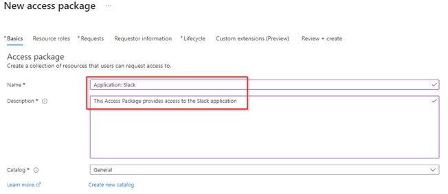Now the application settings within the Catalog have been configured, let’s start with creating an Access Package. Go to the Azure Active Directory –> Identity Governance –> Access Packages and hit ‘New Access Package’. Fill in the ‘Name’ and ‘Description’ of the access package, which is shown to end users, select the catalog (which contains the Slack application we just added) and hit ‘Next: Resource Roles’.
