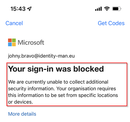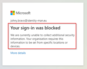 With the above policy enabled and trying to enroll or re-enroll Multi-Factor Authentication with my username and password will result in the following ‘block’ message: