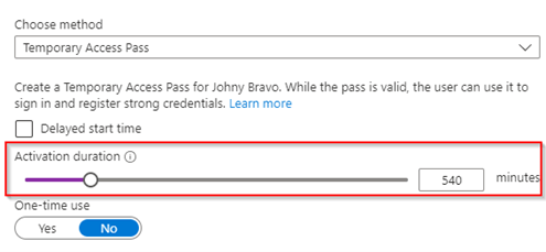 - Users have 10 minutes to complete the enrollment process after they first used their Temporary Access Pass (if one-time usage is enabled).