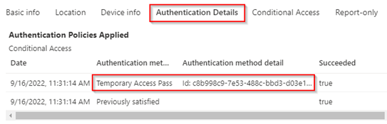 When we from here go to the ‘Authentication Details’ tab, we can see that the user has signed in with their Temporary Access Pass and with that method Strong Factor Authentication a.k.a. Multifactor Authentication has been executed.