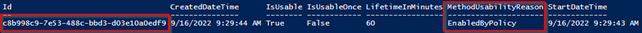 The output of the script is shown below, where we again can see the ID of the Temporary Access Pass and that the ‘MethodUsabilityReason’ is set to ‘EnabledByPolicy’ which means the Temporary Access Pass can be used by the end user from the ‘StartDateTime’. If the Temporary Access Pass was expired the ‘MethodUsabilityReason’ would be set to ‘Expired’.