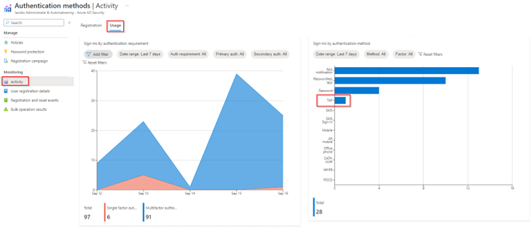 At last, if you want to check the total amount of Sign-ins within your tenant related to the Temporary Access Pass you can go to ‘Azure Active Directory’, click on ‘Security’, hit ‘Authentication Methods’ and select ‘Activity’. On the top hit ‘Usage’ and as you can see on the right side of the screen it states ‘Sign-ins by Authentication Method’. In here you can see that a Temporary Access Pass has been used once in the past 7 days in my tenant.