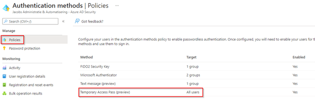 Now we have configured both the Temporary Access Pass Authentication method, we can now generate Temporary Access Passes for end users which we look at in the next step.
