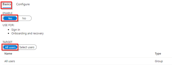 In the ‘Basics tab’set the Enable value to ‘Yes’ and select ‘All users’ or include a specific group.