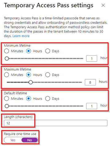 NOTE: The below settings can be treated as a recommended example for regular use, however they can differ case by case, e.g. if you’re planning to use TAP within Identity Lifecycle Workflows the lifetimes could be required to be extended.