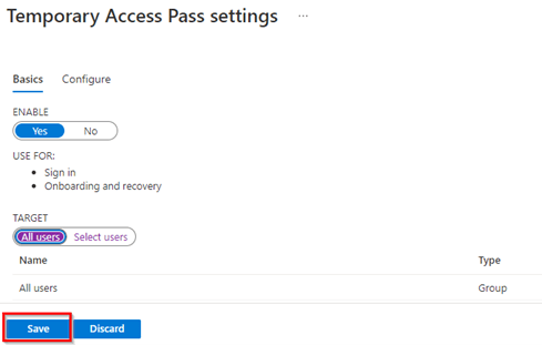 Step 1 – Enable the Temporary Access Pass feature in your tenant.