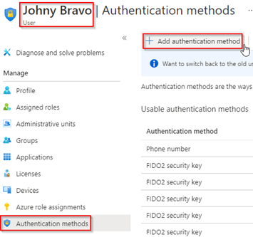 Now to generate a Temporary Access Pass, go to the user account of the user for which you want to generate one, hit the ‘Authentication Methods’ tab and hit ‘+ Add authentication method’