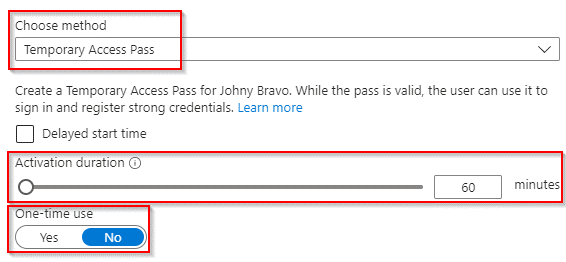 In here select as method ‘Temporary Access Pass’, configure the duration / lifetime (and eventually the delayed start time) and define if it’s a one-time use Temporary Access Pass or if the Temporary Access Pass can be used more than once within the allowed activation time.