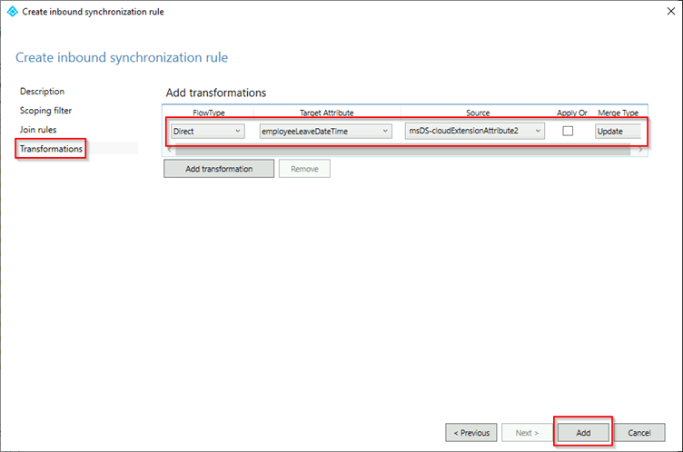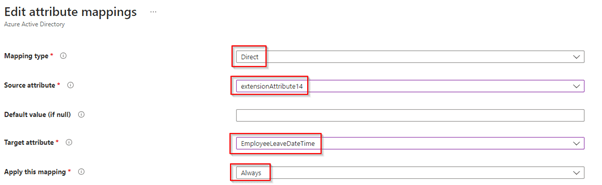- Source attribute: {the source attribute which you are going to use in AD for the EmployeeLeaveDateTime, e.g. extensionAttribute14}