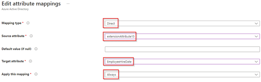- Source: {the source attribute which you are going to use in AD for the EmployeeHireDate, e.g. extensionAttribute15 or msDS-CloudExtensionAttribute1}